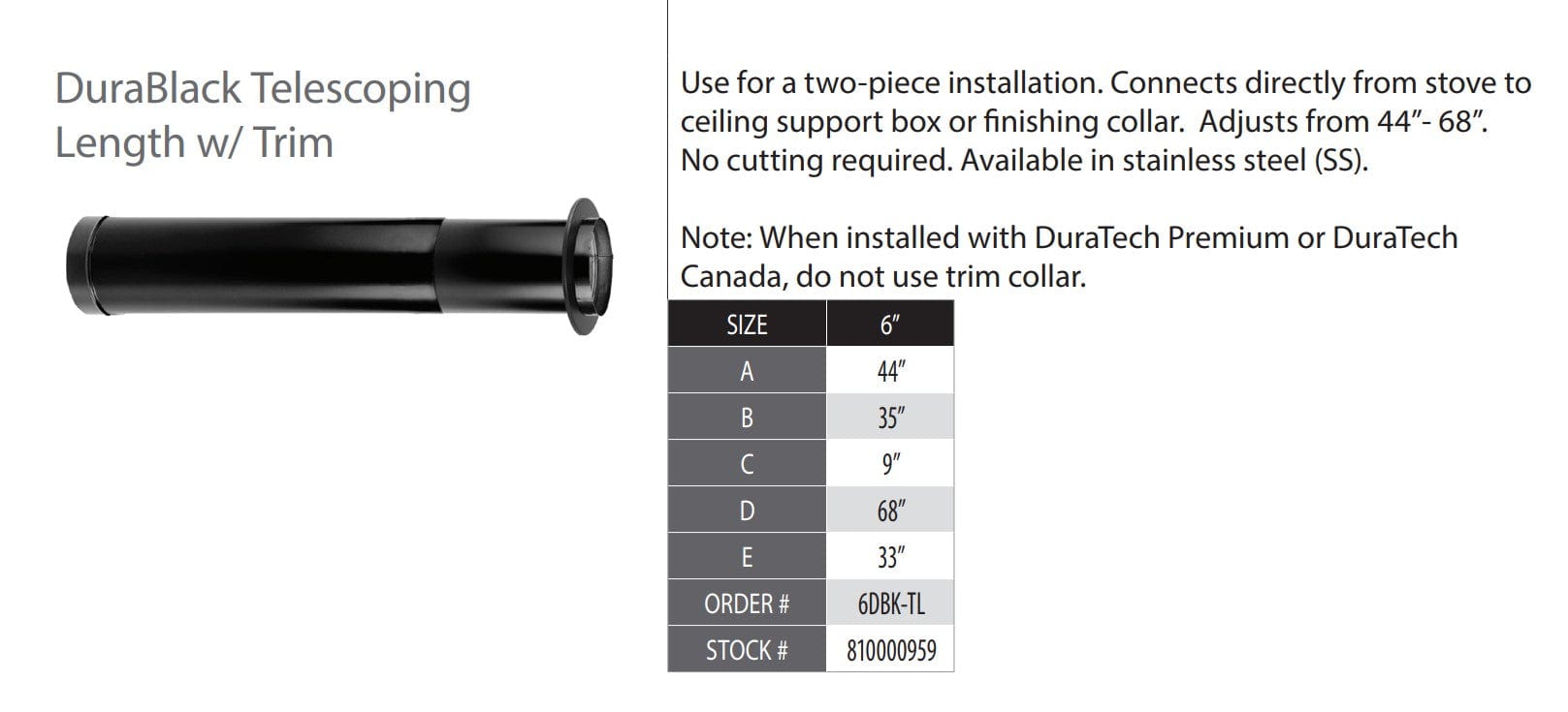 DuraVent DuraBlack 6 Inch Diameter Black Telescoping Length 44 Inch - 68 Inch w/trim - 6DBK-TL