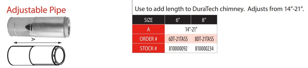 DuraVent DuraTech 8 Inch Diameter Double Wall Galvanized 14-21 Inch Adjustable Chimney Pipe Length - 8DT-21TASS