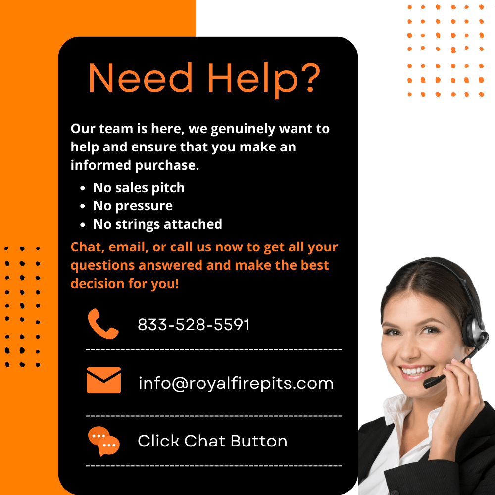 Our team is available Monday–Saturday, 9am–8pm EST. Call or text us at 833-528-5591, or email us at info@royalfirepits.com.
