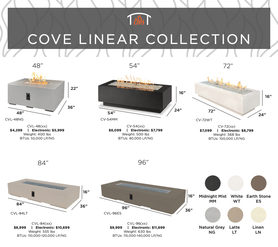 The Outdoor GreatRoom Cove Linear Gas Fire Pit Tableis the ideal complement to any modern outdoor setting. The authentic look of the Supercast™ concrete directs attention to the striking Crystal Fire® Plus burner. Each fire pit boasts a distinctive appearance due to the organic qualities of the concrete, with color variations and casual pitting adding to its charm and individuality.