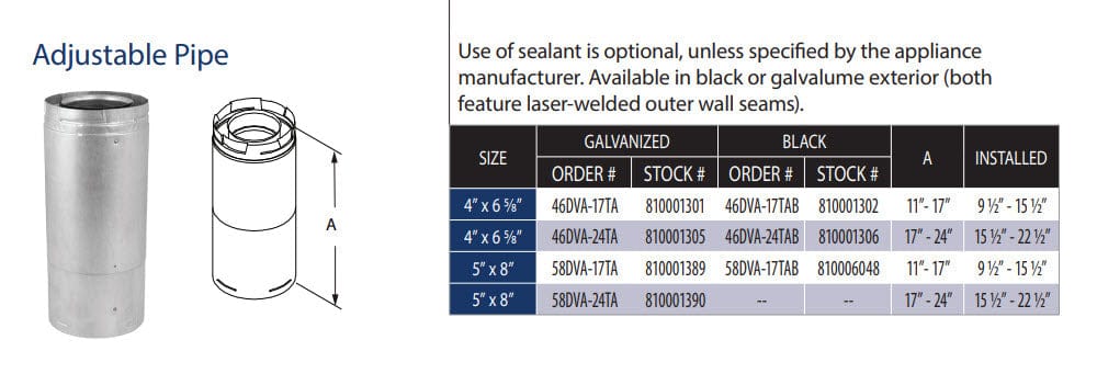 DuraVent DirectVent Pro 4x6-5/8 Inch Diameter Galvanized Direct Vent Adjustable 11-17 Inch Pipe Length - 46DVA-17TA